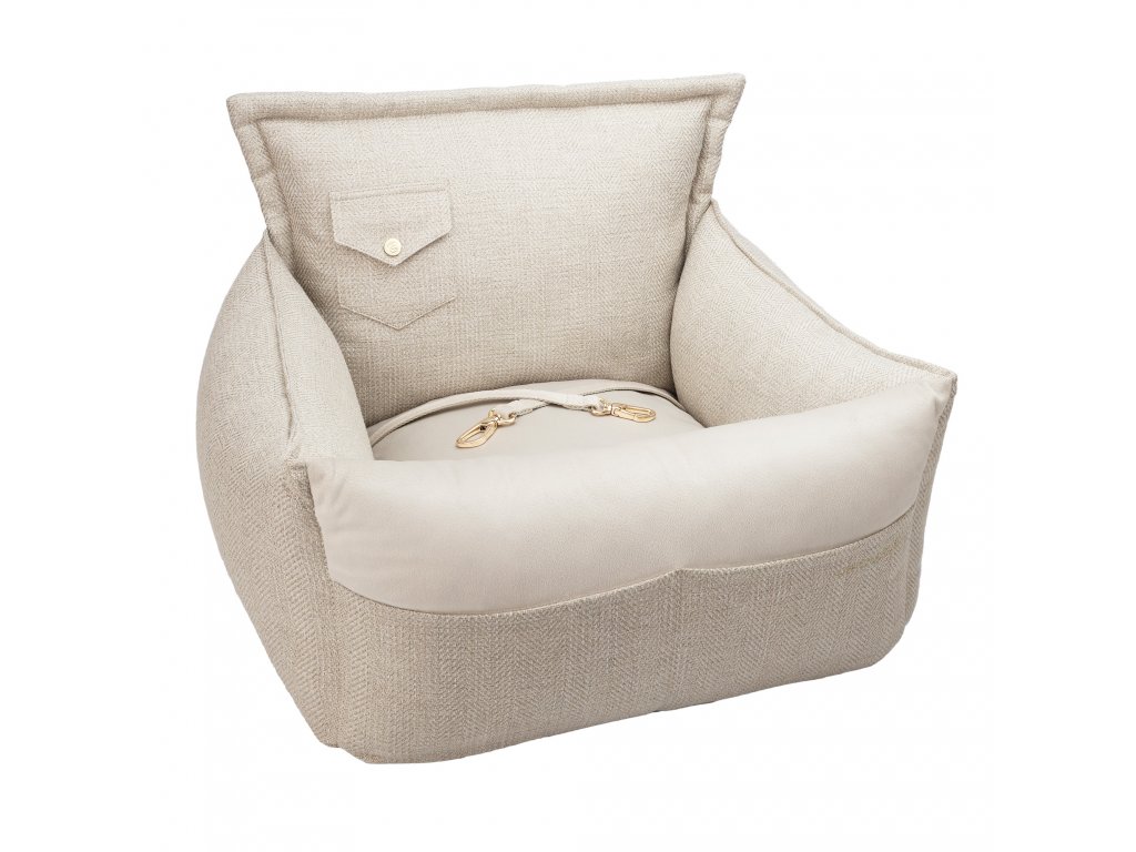 Luxusní autosedačka Winston přitahuje pozornost svým elegantním stylem a smyslem pro detail. Při výběru látek jsme vsadili na módní vzor rybí kosti a sametový akcent na přední části, který podtrhuje moderní charakter sedačky. V místě, kde se obě látky setkávají, jsou dvě skryté kapsy, které jsou praktickým doplňkem. Zadní stěnu zdobí další kapsa, uzavřená zlatým rytím. Sedačka je nadmíru pohodlná a zajišťuje vašemu mazlíčkovi bezpečnou a pohodlnou cestu. Díky odolné konstrukci a vysoce kvalitním tkaninám si zachová svůj vzhled po dlouhou dobu.