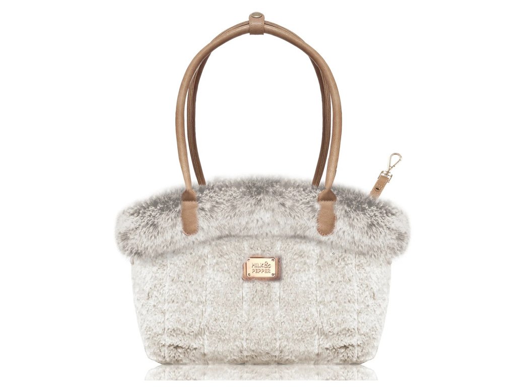 Prošívaná pohodlná šedo-béžová chlupatá taška taška pro psy. Otvory na obou stranách pro nošení na pravé nebo levé straně. Taška je vybavena vyjímatelný polštářem z husté a měkké kožešinky. V tašce pro psy naleznete vnitřní kapsu pro uschování dokladů nebo pamlsků pro pejska. Má odnímatelný ramenní popruh s titanovými karabinami. Taška je je zdobena malým titanovým kovovým štítkem "Milk&Pepper". Pejska uchytíte pomocí vnitřního vodítka z EKO kůže a titanové kovové karabiny. Velmi snadno se udržuje a je vhodná na každodenní použití.