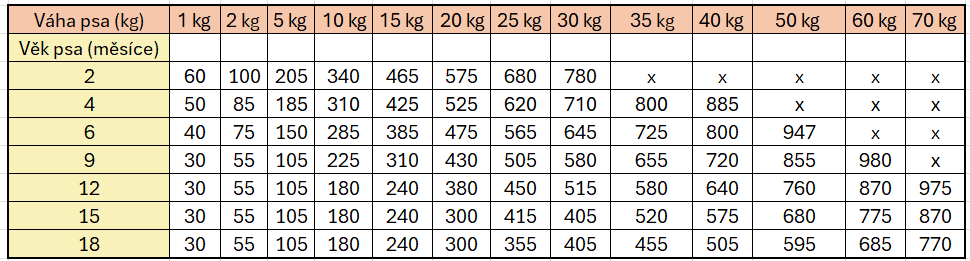 Dávkování: denní dávku u štěňat je doporučeno rozdělit na 3 - 5 porcí