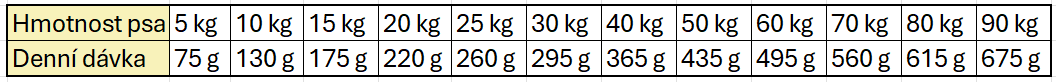hrubý protein 26 %, hrubý tuk 15 %, vlhkost 10 %, hrubý popel 7,5 %, hrubá vláknina 4,5 %, vápník 1,6 %, fosfor 1,2 %, sodík 0,1 %, omega-3 mastné kyseliny 0,3 %, omega-6 mastné kyseliny 2,2 %