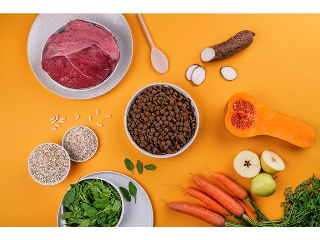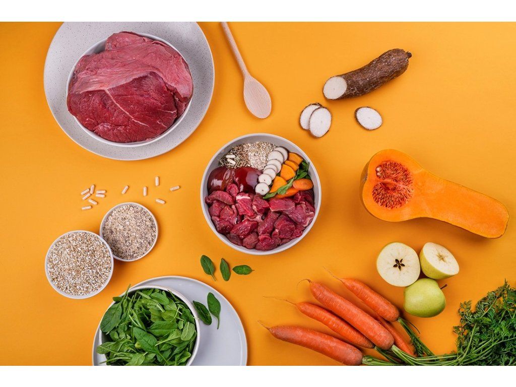 čerstvé hovězí (35 %), sušené hovězí (20 %), ovesné vločky (12 %), sušená jablečná dužina (8 %), hovězí tuk (7 %), dýně (5 %), pohanka (5 %), přírodní aroma (vývar z jater) (2 %), pivovarské kvasnice (2 %), lososový olej (1 %), mrkev (1 %), sušený špenát (1 %), hrachová mouka, sušený srdečník (0,1 %), glukosamin (0,022 %), chondroitin sulfát (0,015 %), frukto-oligosacharidy (0,02 %), mannan-oligosacharidy (0,015 %), Mojave yucca (0,01 %), semena ostropestřce mariánského (0,005 %), probiotika Lactobacillus helveticus HA – 122 inaktivováno (15x10⁹ buněk/kg)