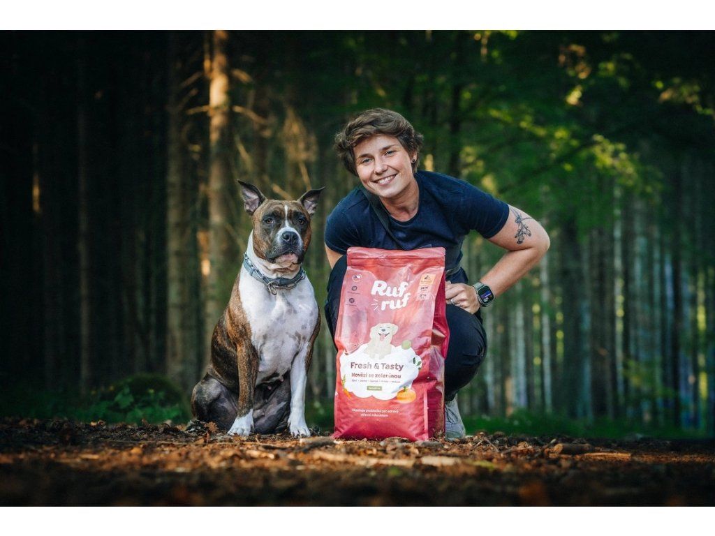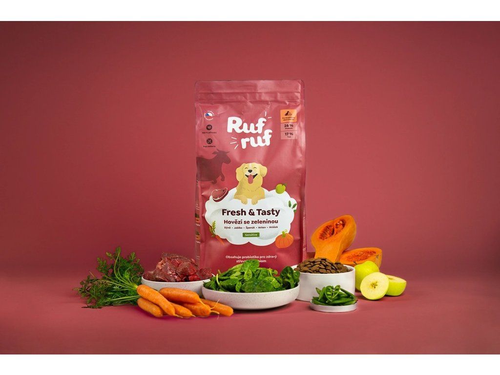 Granule pro psy, které podpoří celkové zdraví a psychickou pohodu vašeho mazlíčka. Rufruf Fresh & Tasty s hovězím masem a zeleninou jsou prémiové granule pro psy vyrobené z poctivých 66 % čerstvého hovězího masa z volných pastvin, doplněné o 16 % hrášku bez slupek a 5 % čerstvé dýně, špenátu a mrkve.