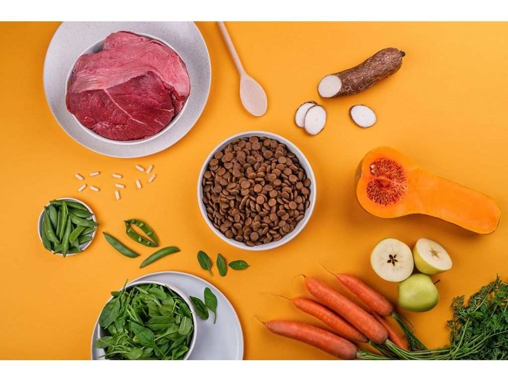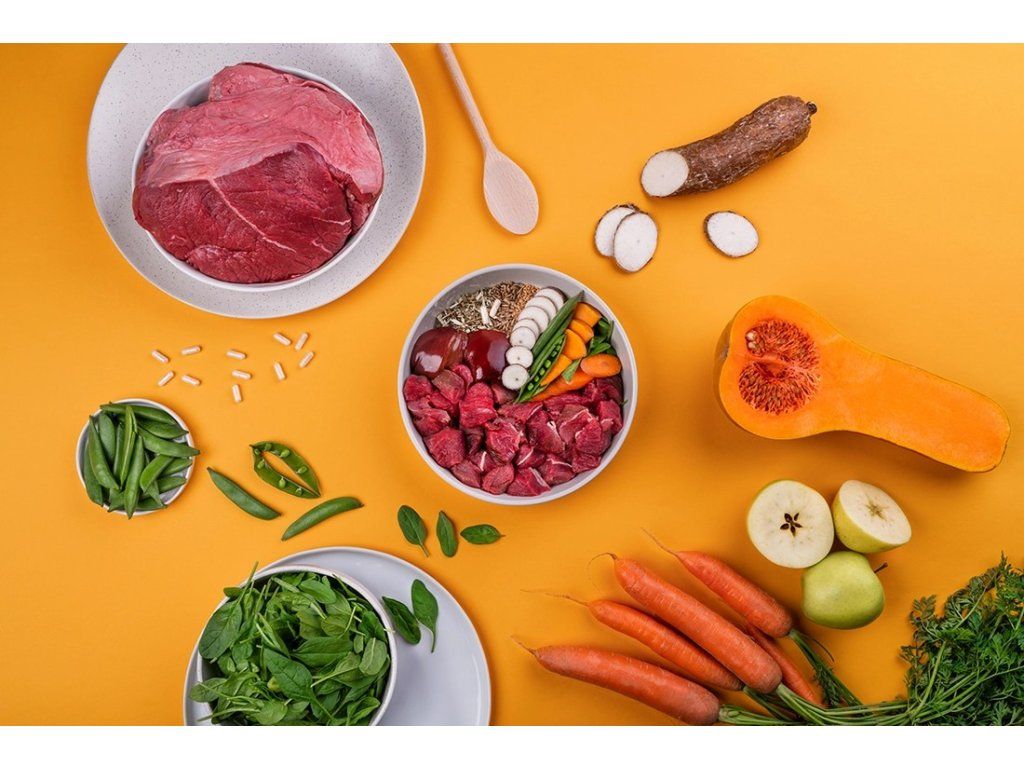 čerstvé hovězí (50 %), sušené hovězí (16 %), hrách (16 %), hovězí tuk (5 %), dýně (2 %), sušená jablečná dužina (2 %), přírodní aroma (vývar z jater) (2 %), lososový olej (2 %), lněné semínko (2 %), sušené vaječné skořápky (1 %), hrachová mouka, sušený špenát (0,5 %), mrkev (0,5 %), sušený srdečník (0,1 %), glukosamin (0,026 %), chondroitin sulfát (0,016 %), frukto-oligosacharidy (0,02 %), mannan-oligosacharidy (0,015 %), Mojave yucca (0,01 %), semena ostropestřce mariánského (0,008 %), probiotika Lactobacillus helveticus HA – 122 inaktivováno (15x109 buněk/kg)