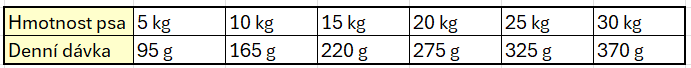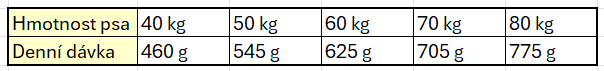 hrubý protein 24 %, hrubý tuk 15 %, vlhkost 8 %, hrubý popel 8 %, hrubá vláknina 2,5 %, vápník 1,8 %, fosfor 1,2 %, omega-3 mastné kyseliny 0,4 %, omega-6 mastné kyseliny 2,4 %