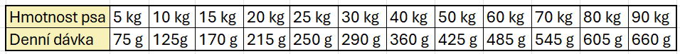 hrubý protein 26 %, hrubý tuk 15 %, vlhkost 10 %, hrubý popel 7,3 %, hrubá vláknina 3,5 %, vápník 1,4 %, fosfor 0,8 %, sodík 0,3 %, omega-3 mastné kyseliny 0,1 %, omega-6 mastné kyseliny 0,3 %