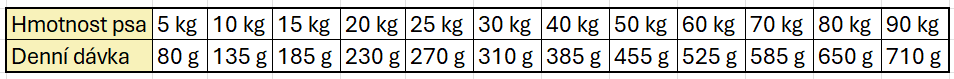 hrubý protein 25 %, hrubý tuk 13 %, vlhkost 10 %, hrubý popel 7 %, hrubá vláknina 6 %, vápník 1,3 %, fosfor 0,9 %, sodík 0,1 %, omega-3 mastné kyseliny 0,3 %, omega-6 mastné kyseliny 1,7 %