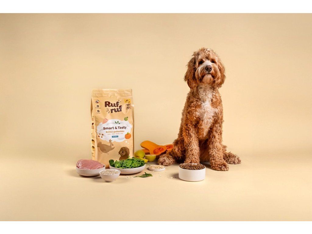 Granule pro psy, které kombinují špičkovou chuť a maximální péči o zdraví, Rufruf Smart & Tasty Krůta s pohankou jsou ideální volbou pro každého páníčka, kterému záleží na tzv. well-being krmivu. Tyto granule pro psy jsou unikátní svým složením bez chemie, sóji a kukuřice, přičemž obsahují 55 % krůtího masa z volných pastvin, které je lehce stravitelné a bohaté na proteiny i aminokyseliny. Díky šetrné tepelné úpravě v páře do 90 °C si tyto granule pro psy zachovávají maximum přirozených vitamínů a minerálů, což z nich dělá skvělé granule pro psy s citlivým zažíváním.