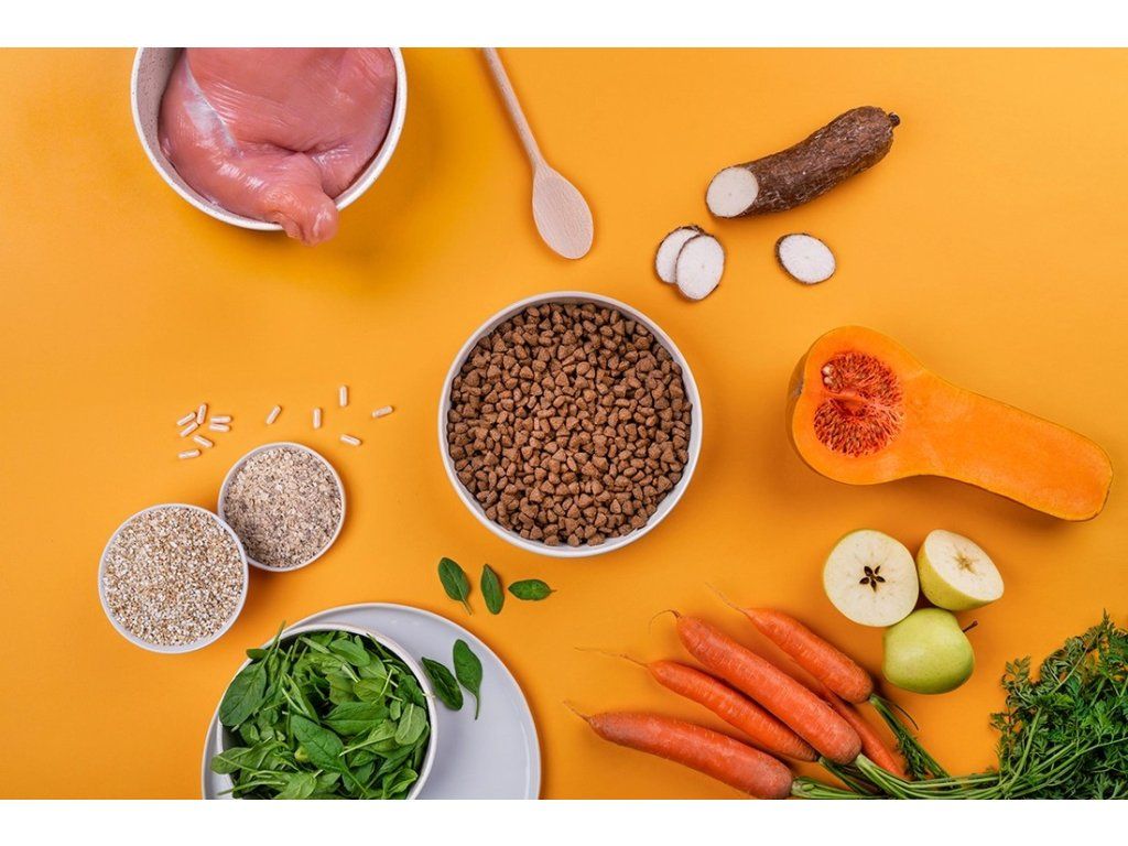 čerstvá krůta (35 %), sušená krůta (20 %), ovesné vločky (12 %), sušená jablečná dužina (9 %), dýně (5 %), pohanka (5 %), kuřecí tuk (4 %), lignocelulóza (2 %), přírodní aroma (vývar z jater) (2 %), pivovarské kvasnice (2 %), lososový olej (1 %), mrkev (1 %), sušený špenát (1 %), hrachová mouka, sušený srdečník (0,1 %), glukosamin (0,022 %), chondroitin sulfát (0,015 %), frukto-oligosacharidy (0,02 %), mannan-oligosacharidy (0,015 %), Mojave yucca (0,01 %), semena ostropestřce mariánského (0,005%), probiotika Lactobacillus helveticus HA - 122 inaktivováno (15x109 buněk/kg)
