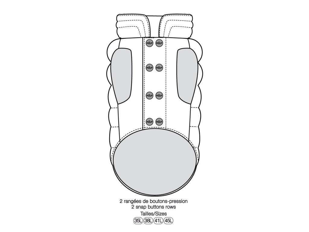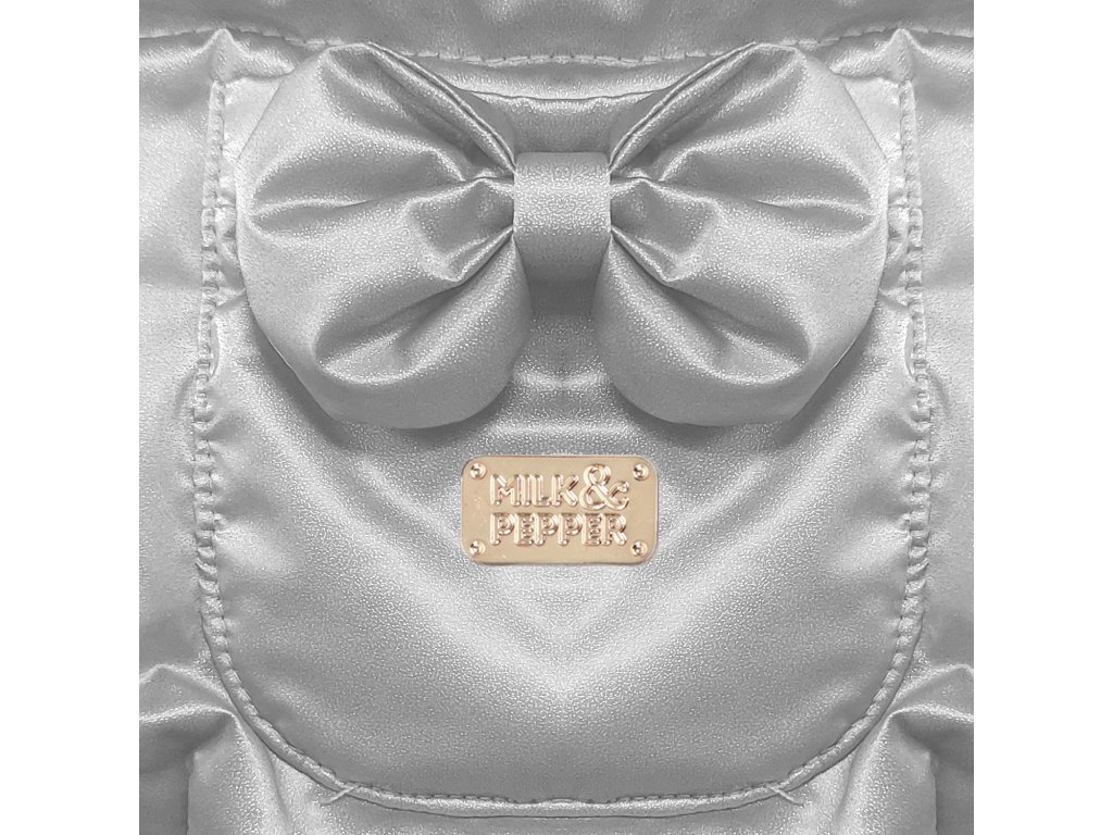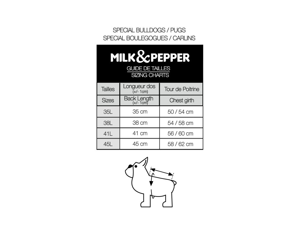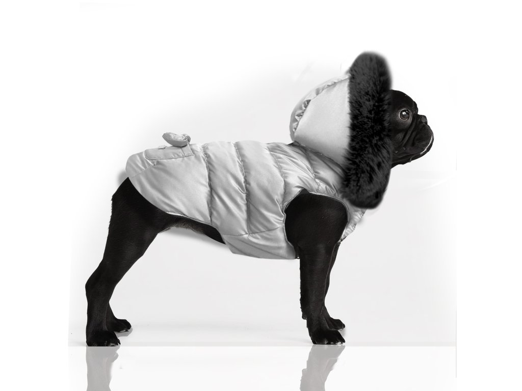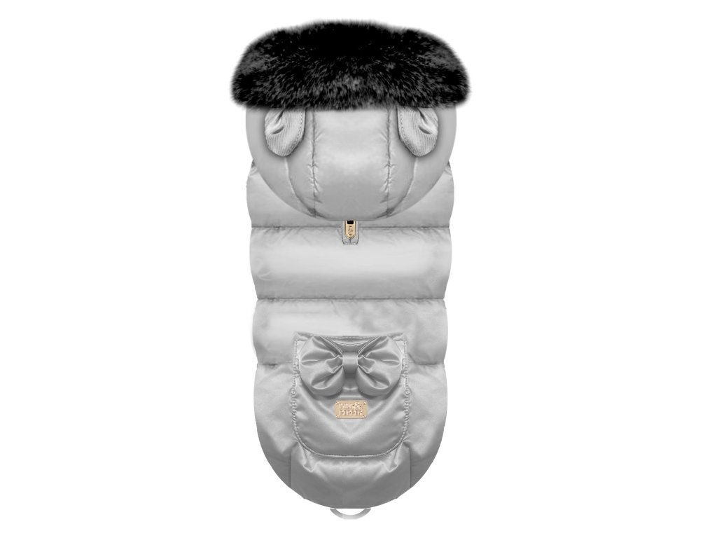 Zimní kabát pro buldočky s kapucí a hřejivým límečkem. Kabát tvoří voděodolná vrstva ze šedého saténu s mašlí a z druhé strany příjemně měkký a hřejivý kožíšek. Kabát pro psy má na hřbetní straně rozepínací otvor na zip. Pod kabátek lze nosit postroj, který lze upevnit skrze rozepínací otvor na horní straně kabátku. Kabátek má zapínání na zlaté patentky s vyrytým logem M&P. Kabát je z lehkých materiálů, pejsek ani neucítí, že ho má na sobě.