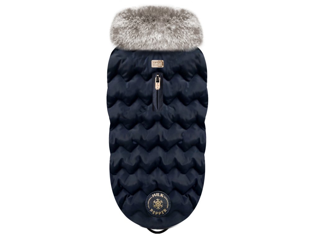 Zimní kabát pro psy s hřejivou kožešinkou. Kabát tvoří z jedné strany voděodolná vrstva z námořnicky modrého saténu a druhá strana je z příjemně měkkého a hřejivého kožíšku. Kabát pro psy má na hřbetní straně rozepínací otvor na zip. Pod kabátek lze nosit postroj, který lze upevnit skrze rozepínací otvor na horní straně kabátku. Kabátek má zapínání na stříbrné patentky s vyrytým logem M&P. Kabát je z lehkých materiálů, pejsek ani neucítí, že ho má na sobě.