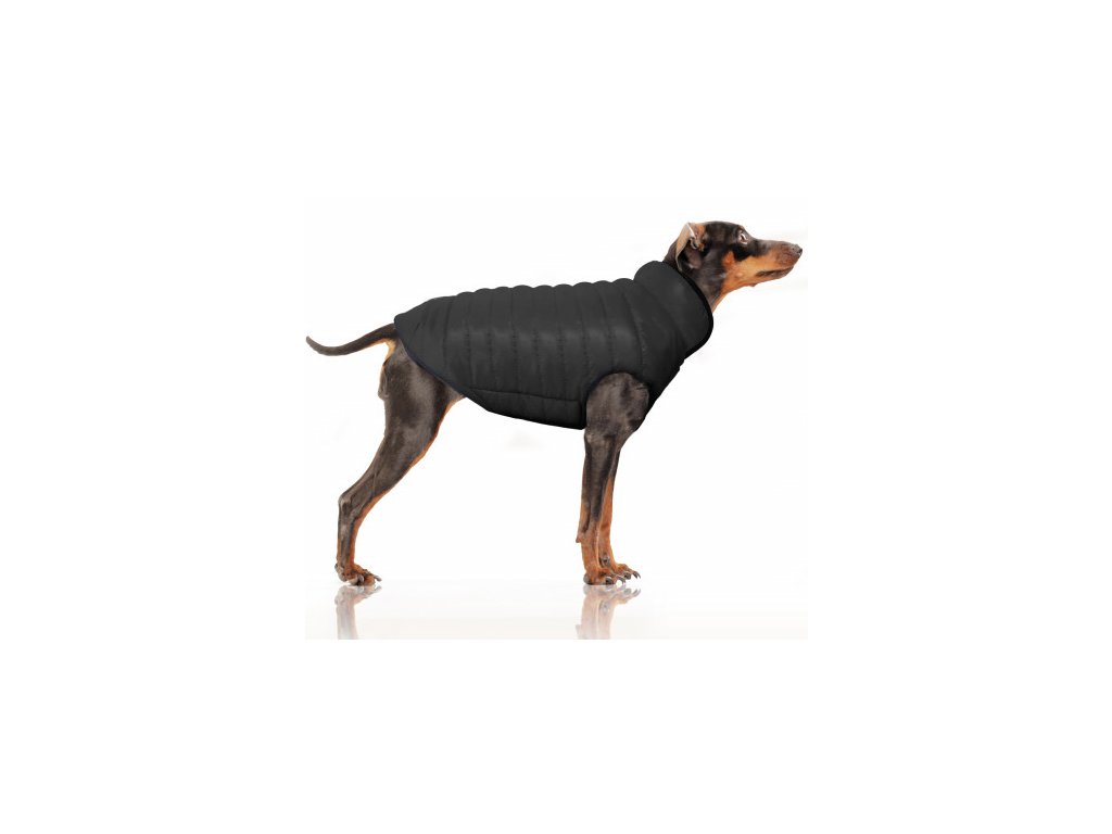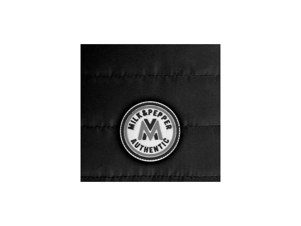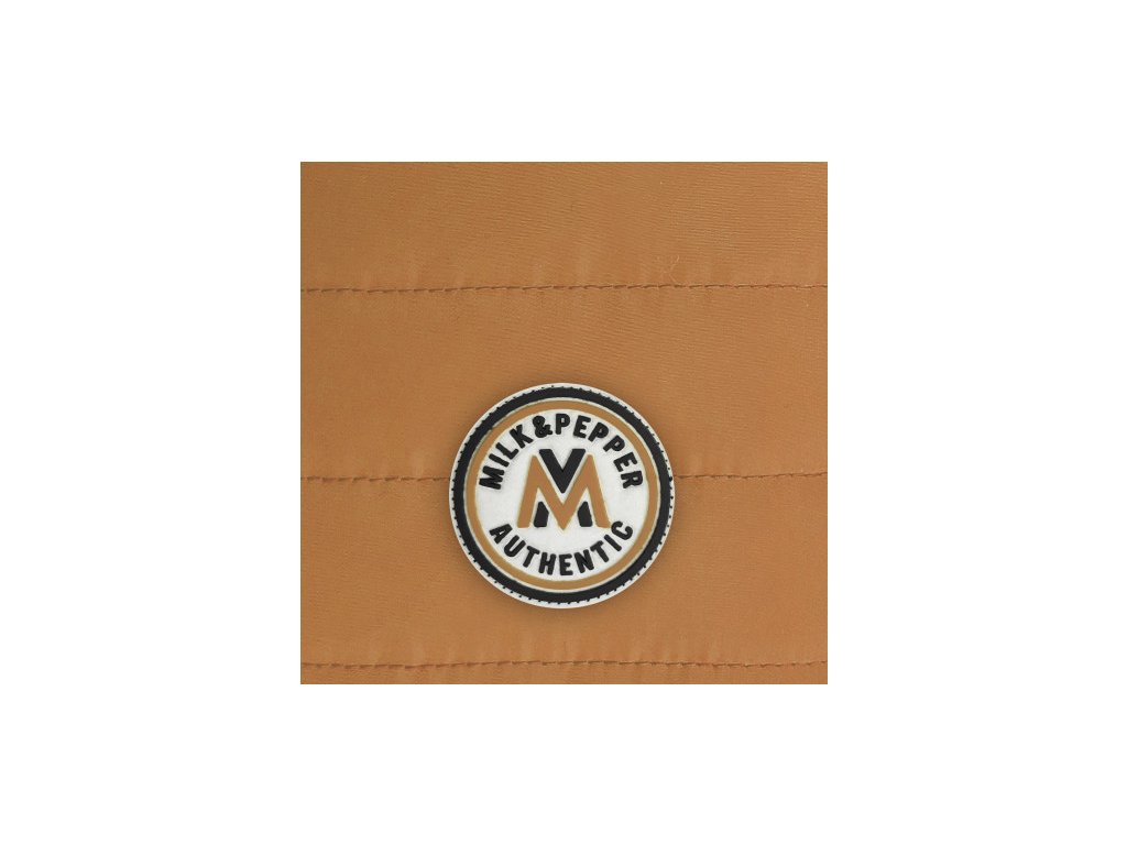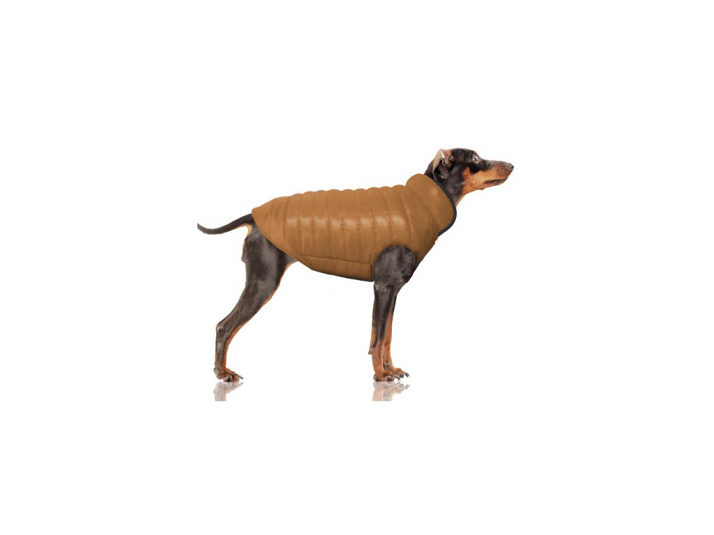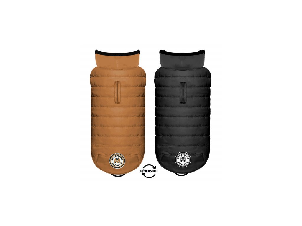Kabát pro psy s límcem. Kabát je vyroben z vrstvy voděodolného hnědého saténu. Pod kabátek lze nosit postroj, který lze upevnit skrze rozepínací otvor na horní straně kabátku. Kabátek má zapínání na černé patentky s vyrytým logem M&P. Kabát je z lehkých materiálů, pejsek ani neucítí, že ho má na sobě.