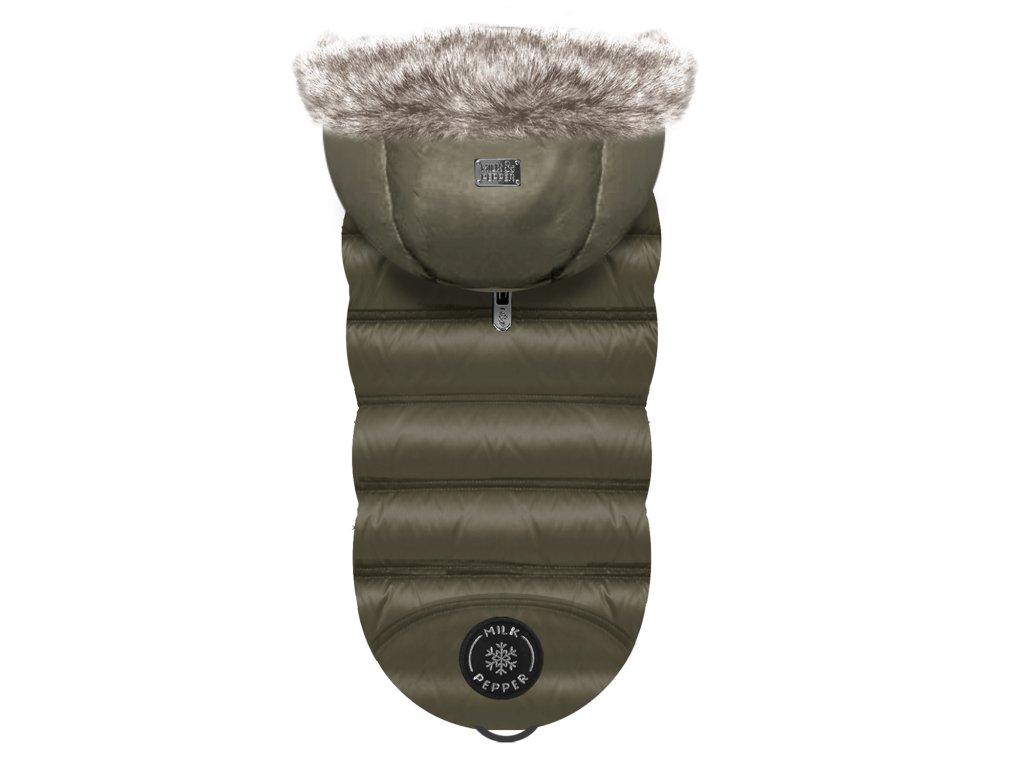 Zimní kabát pro psy Hans s hřejivým límečkem. Stylový a pohodlný kabát pro psy, navržený tak, aby poskytoval teplo a ochranu během chladných dnů. Kabát tvoří voděodolná prošitá vrstva z khaki saténu a z druhé strany příjemně měkký a hřejivý kožíšek. Pod kabátek je možné nosit postroj, který lze upevnit skrze rozepínací otvor na horní straně kabátku. Má zapínání na zlaté patentky s vyrytým logem M&P a módní látkovou nášivku. Tento kabát je vyroben z kvalitního materiálu, který je šetrný k citlivé pokožce psů. Snadno se obléká a je přizpůsoben specifické postavě psů, aby je neomezoval v pohybu. Skvělý doplněk na procházky v chladném počasí!