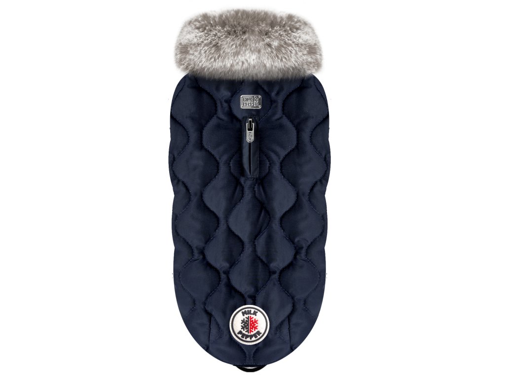 Zimní kabát pro psy s hřejivou kožešinkou. Kabát tvoří z jedné strany voděodolná vrstva z námořnicky modrého saténu a druhá strana je z příjemně měkkého a hřejivého kožíšku. Kabát pro psy má na hřbetní straně rozepínací otvor na zip. Pod kabátek lze nosit postroj, který lze upevnit skrze rozepínací otvor na horní straně kabátku. Kabátek má zapínání na stříbrné patentky s vyrytým logem M&P. Kabát je z lehkých materiálů, pejsek ani neucítí, že ho má na sobě.