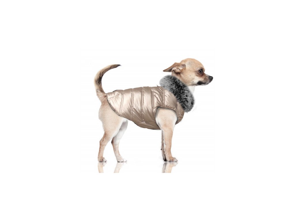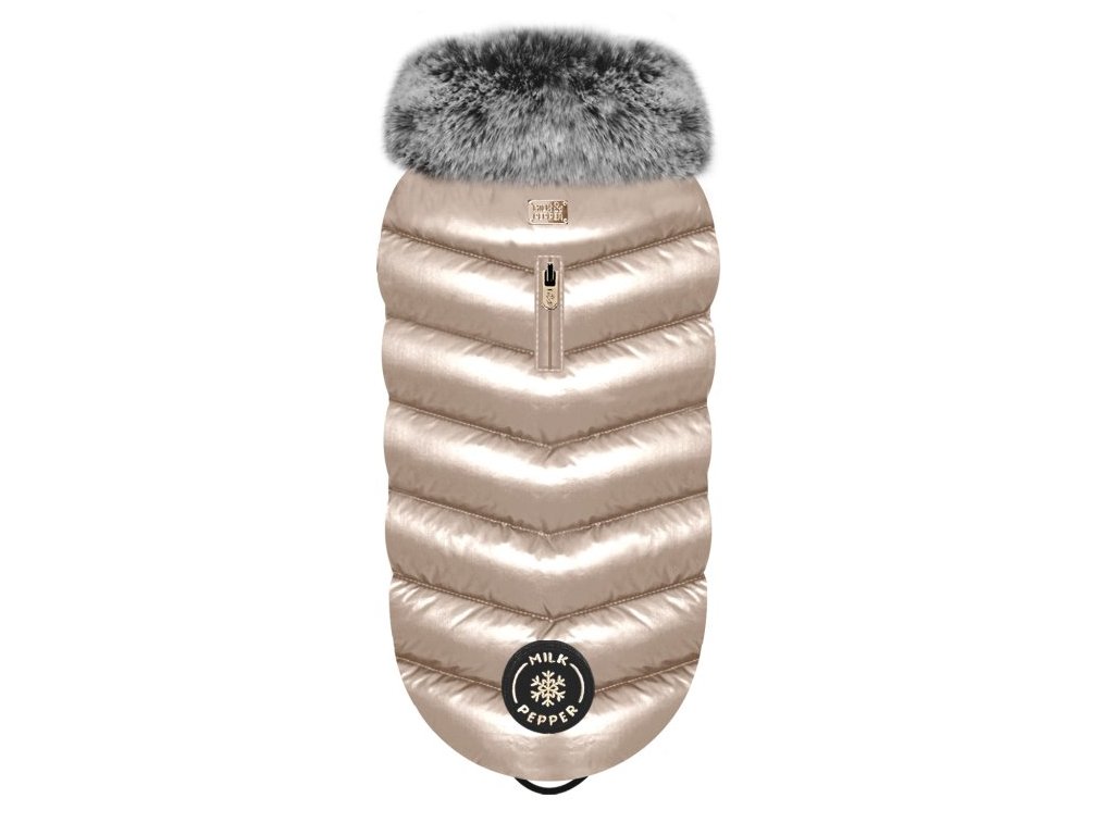 Zimní kabát Abby pro psy je vybavený hřejivým límečkem. Kabát tvoří voděodolná prošitá vrstva ze saténu v barvě rose gold a z druhé strany příjemně měkký a hřejivý kožíšek. Kabát pro psy má na hřbetní straně rozepínací otvor na zip. Pod kabátek je možné nosit postroj, který lze upevnit skrze rozepínací otvor na horní straně kabátku. Kabátek má zapínání na zlaté patentky s vyrytým logem M&P a módní látkovou nášivku. Kabát je z lehkých materiálů, pejsek ani neucítí, že ho má na sobě.