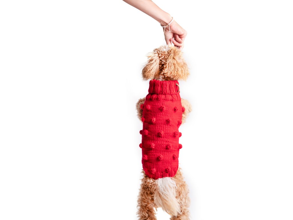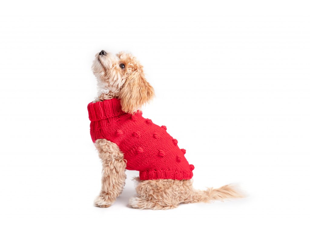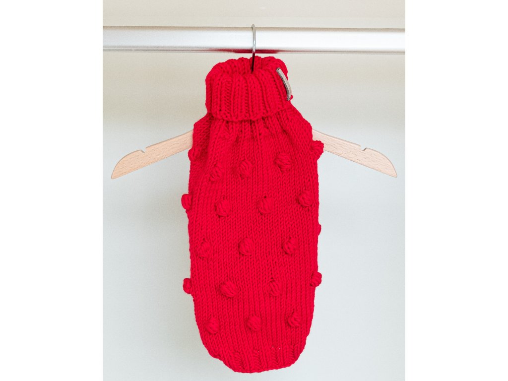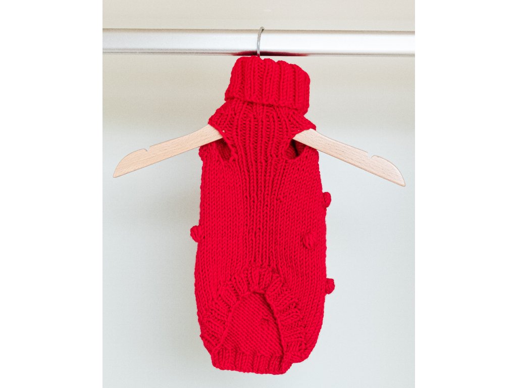 Luxusní ručně pletený svetr pro Vaší fenku či kočičku do chladných dnů. Dekorován koženým logem na roláku a bambulkami. Pokud nenajdete skladem velikost, kterou potřebujete, neváhejte nám zavolat. Do týdne jsme vám schopni svetřík dodat.