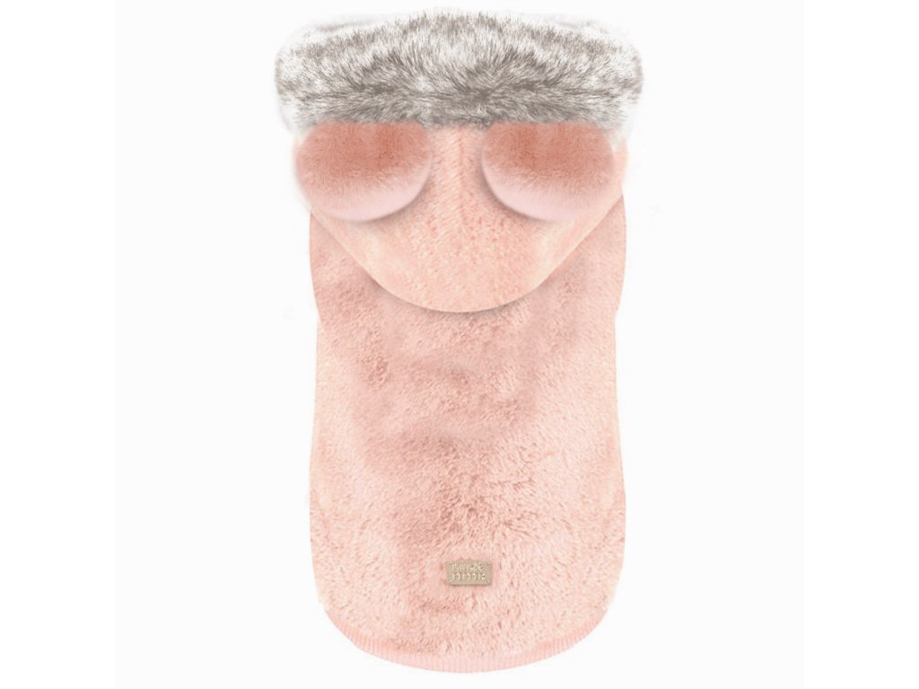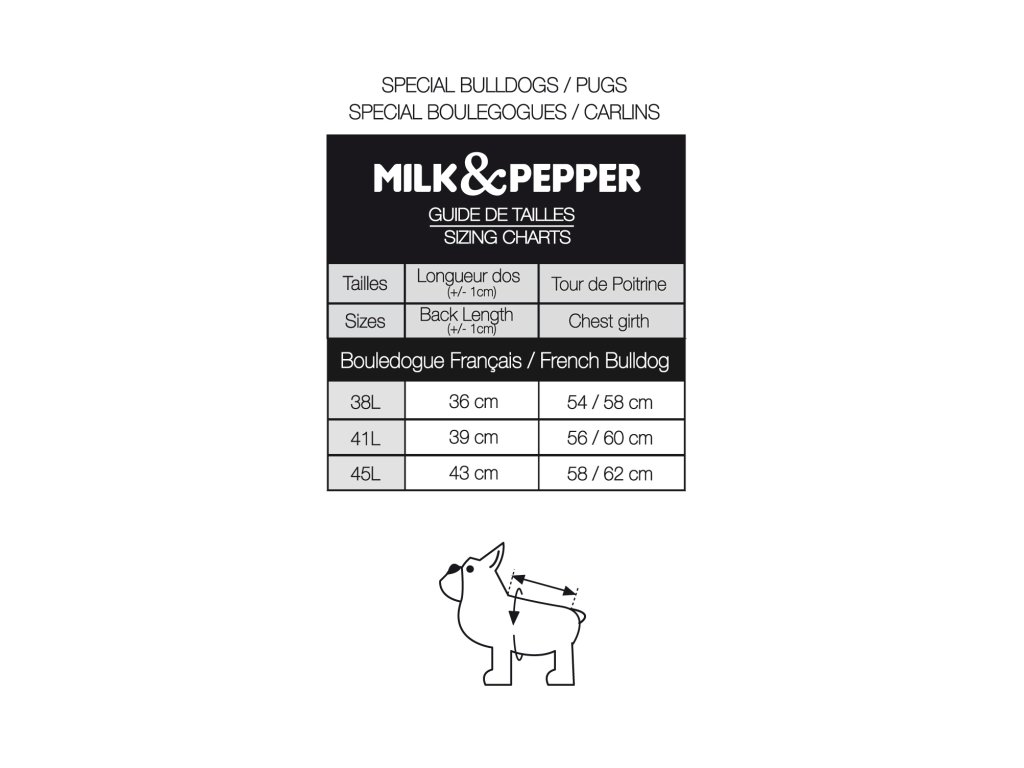 Hřejivá mikina pro buldočka je vhodná především na chladné podzimní a jarní večery, ale i na zimu, a to pro menší a středně velké pejsky. Mikina zaujme především huňatým límcem a pohodlným střihem. Mikina zakrývá celý hřbet a bříško. Psí obleček je opatřen kapucí s roztomilýma ušima, takže váš chlupatý mazlíček oslní na každé procházce. Na kapuci obleček zdobí nápis Milk&Pepper. V případě ušpinění je možné mikinu vyprat v pračce na 30°C.