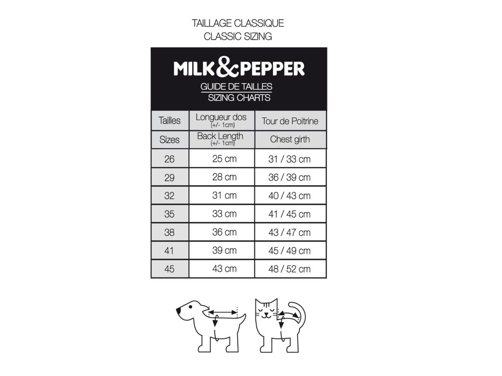 Hřejivá mikina pro psa je vhodná především na chladné podzimní a jarní večery, ale i na zimu, a to pro menší a středně velké pejsky. Mikina zaujme především huňatým límcem a pohodlným střihem. Mikina zakrývá celý hřbet a bříško. Psí obleček je opatřen kapucí s roztomilýma ušima, takže váš chlupatý mazlíček oslní na každé procházce. Na kapuci obleček zdobí nápis Milk&Pepper. V případě ušpinění je možné mikinu vyprat v pračce na 30°C.