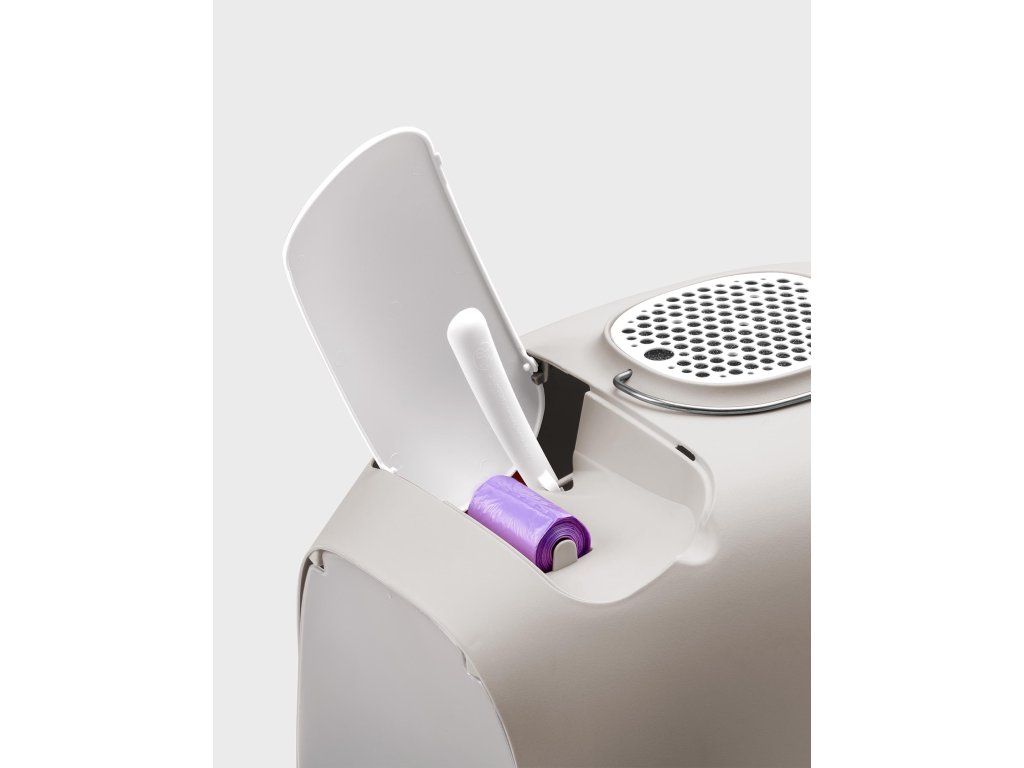 Designový prostorový záchod pro kočky vyroben ze 100% polypropylénu. Toaleta má dvířka, kterými snadno kočka projde. Na vrchu opatřena madlem pro snadné přenášení. Součástí toalety je uhlíkový filtr, lopatka a náhradní sáčky (15 ks), které jsou šikovně skryty v úložném prostoru toalety. K toaletě je speciálně navržena je protiskluzová podložka. Nahrání filtry, sáčky a podložku naleznete v naší nabídce. Vyrobeno v Itálii.