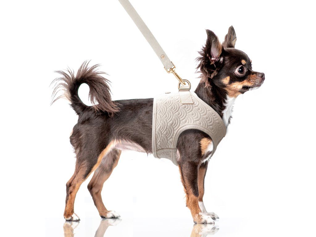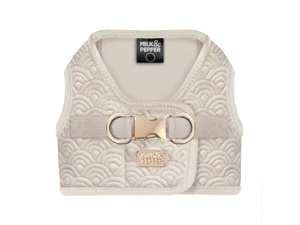 Elegantní prošívaný postroj pro psy typu vestička od prémiové značky Milk & Pepper v jemném béžovém odstínu je ideální volbou pro malé a střední psy, kteří si potrpí na styl i pohodlí. Jako velmi komfortní postroj pro psy je vyroben ze 100% bavlny, a to jak na vnější straně s efektním vzorem, tak i na vnitřní podšívce, což zajišťuje maximální prodyšnost během nošení.