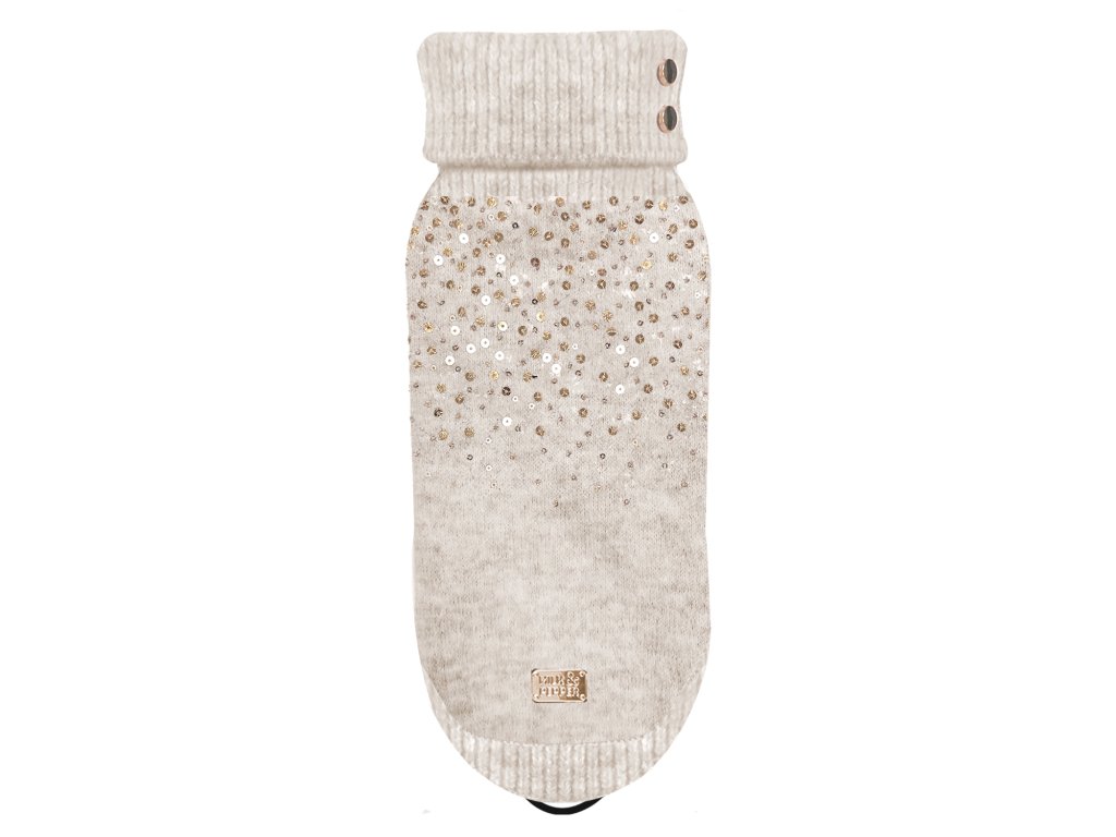 Luxusní béžový pletený svetr s flitry a glitry je vhodný především na chladné podzimní a jarní večery, ale i na zimu, a to pro menší a středně velké pejsky. Svetr zaujme především pohodlným střihem a velmi pružným materiálem. Zakrývá celý hřbet a bříško. Psí obleček je opatřen třpytivým dekorováním, takže váš chlupatý mazlíček oslní na každé procházce. V případě ušpinění je možné svetr vyprat v pračce na program vlna při 30°C.