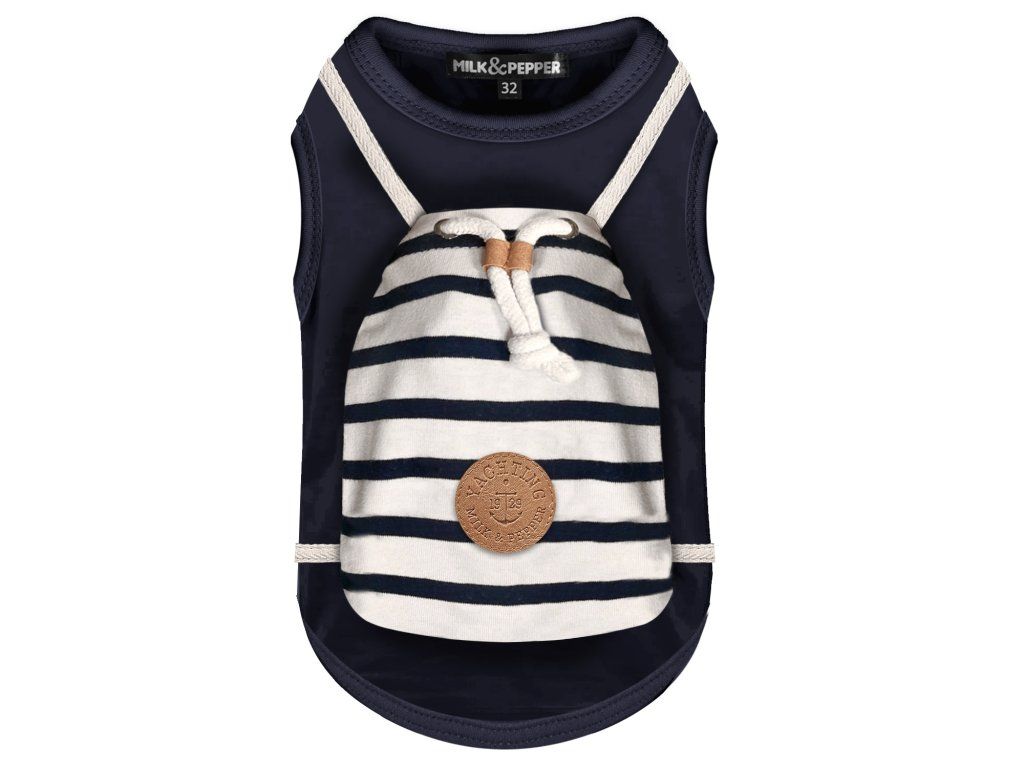 Stylové námořnické triko pro psy od prestižní francouzské značky Milk & Pepper v tmavě modré barvě je naprostým hitem pro malé a střední psy. Toto unikátní triko pro psy zaujme na první pohled originálním designem s integrovaným pruhovaným vakem na zádech, který zdobí koženková nášivka s kotvou a stylové stahovací šňůrky. Triko pro psy je vyrobeno z kvalitního a pružného materiálu (95% polyester, 5% elastan), který se skvěle přizpůsobí postavě a zajistí, že se v něm Váš mazlíček bude cítit pohodlně po celý den.